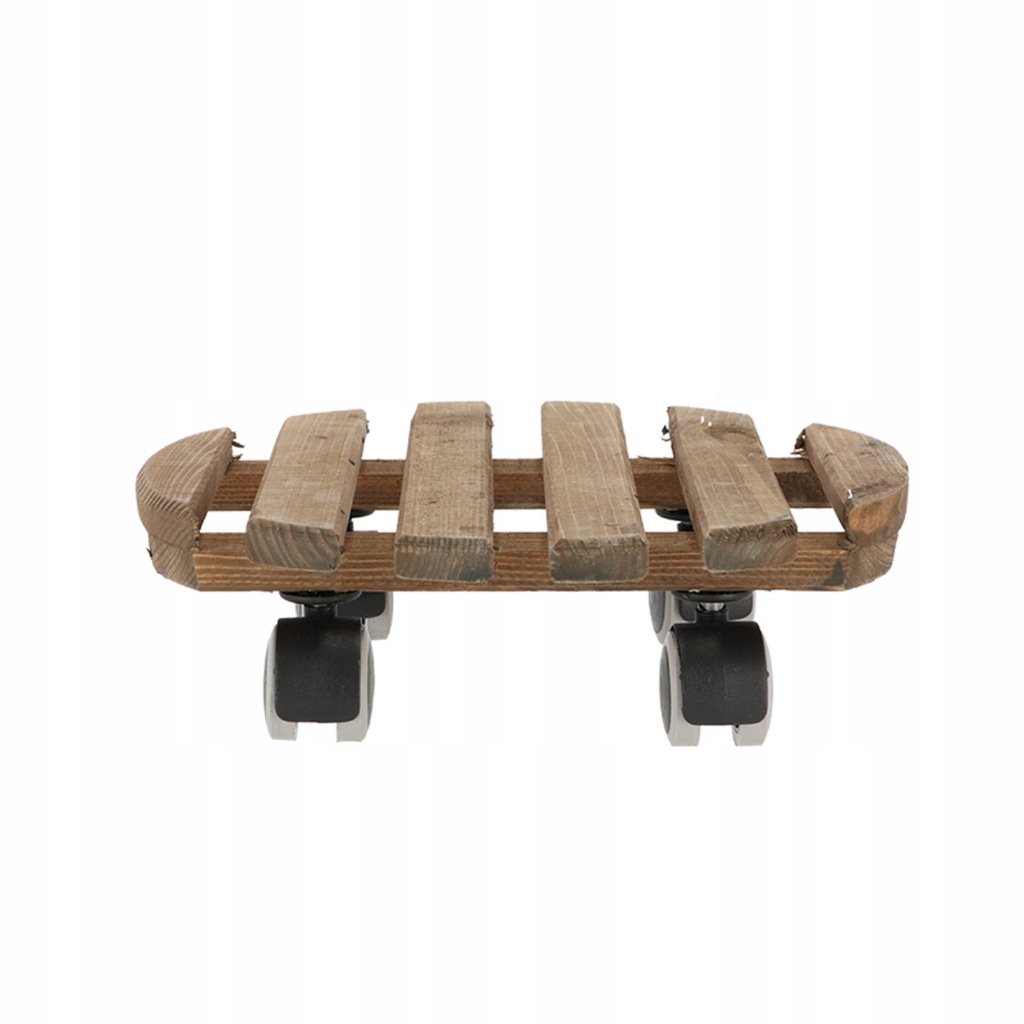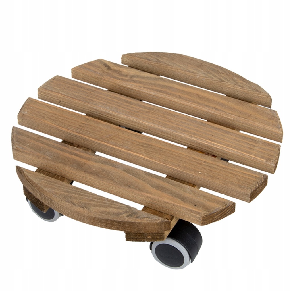 Podstawka okrągła pod doniczkę lub stojak na kwiaty wyposażony w 4 kółka, wykonany z naturalnego drewna sosnowego z certyfikatem FSC. Praktyczny wózek do użytku w pomieszczeniach jak i na tarasie lub ogrodzie.
