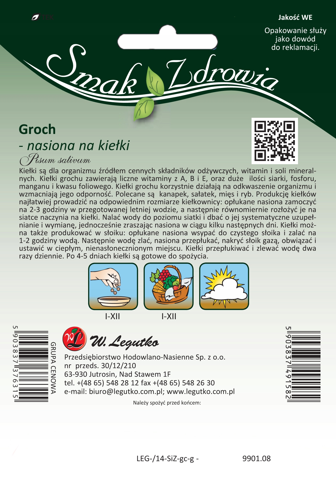W opakowaniu znajduje się 50 gram nasion na kiełki – groch. Na torebce znajdują się wskazówki na temat uprawy kiełków i termin przydatności do wysiewu.