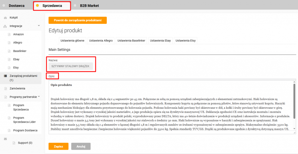 Większość danych produktowych jest już zdefiniowana przez Dostawcę produktu, Ty jako Sprzedawca możesz z poziomu platformy Selleetools zmienić tytuł i opis produktu, marżę i kategorię. Wszystkie inne elementy oferty nie mogą być edytowane z poziomu platformy. Jednak – już z poziomu samego marketplace np. Allegro – możesz zarządzać dowolnymi parametrami oferty. Pamiętaj jednak, że Selleetools nie odpowiada za zmiany wprowadzone przez Sprzedawcę samodzielnie na marketplace.