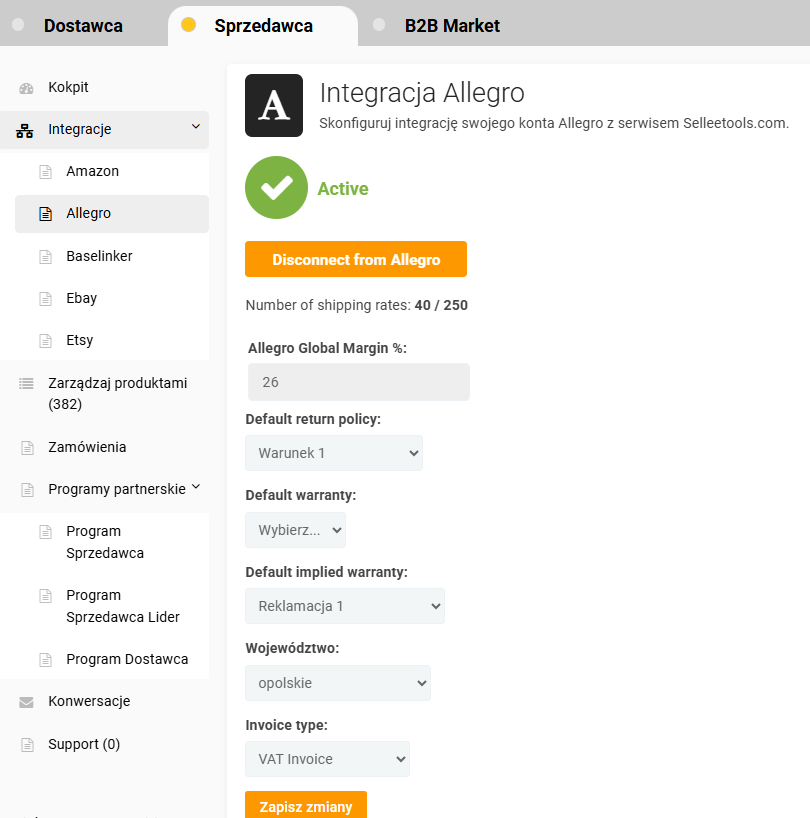 Ustawienia główne integracji na Selleetools z perspektywy Sprzedawcy