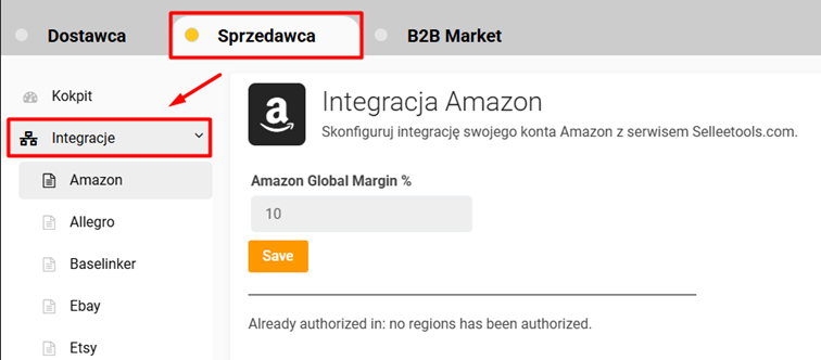W pierwszym kroku musisz połączyć swoje konto sprzedażowe Selleetools z wybranym marketplace. Jeśli sprzedajesz na wielu marketplace’ach – zintegruj je wszystkie. Możesz to zrobić z poziomu zakładki Integracje.