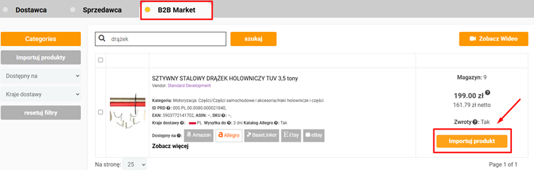 Mając już wszystkie ustawienia, możesz przejść do wyboru produktów, które chcesz odsprzedawać. Wystarczy, że zaimportujesz na swoje konto Selleetools wybrane produkty z B2B Market – wskoczą one w zakładkę ‘Zarządzaj produktami’. Z poziomu tej zakładki będziesz w następnym kroku wykonywać eksport na marketplace.