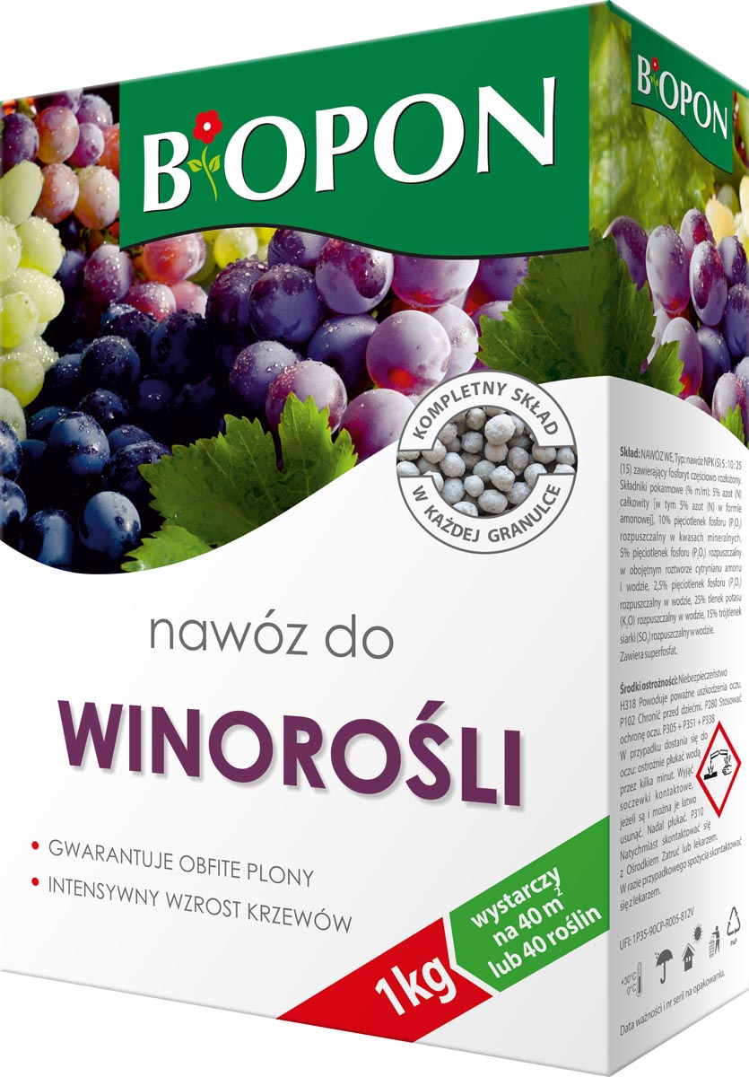 SKŁAD: AZOT 5%, FOSFOR 10%, POTAS 25%, SIARKA 15% + mikroelementy. Wieloskładnikowy, specjalistyczny nawóz mineralny przeznaczony do zasilania krzewów winorośli. Zastosowanie nawozu przed sadzeniem zapewnia optymalne warunki do rozwoju rośliny. Zasilanie w trakcie wzrostu dostarcza roślinie wszystkie niezbędne składniki mineralne. Zawartość potasu wpływa na intensywny wzrost oraz obfite owocowanie. Nawóz doskonale nadaje się również do zasilania krzewów jagodowych: malin, jeżyn, agrestu czy porzeczek.