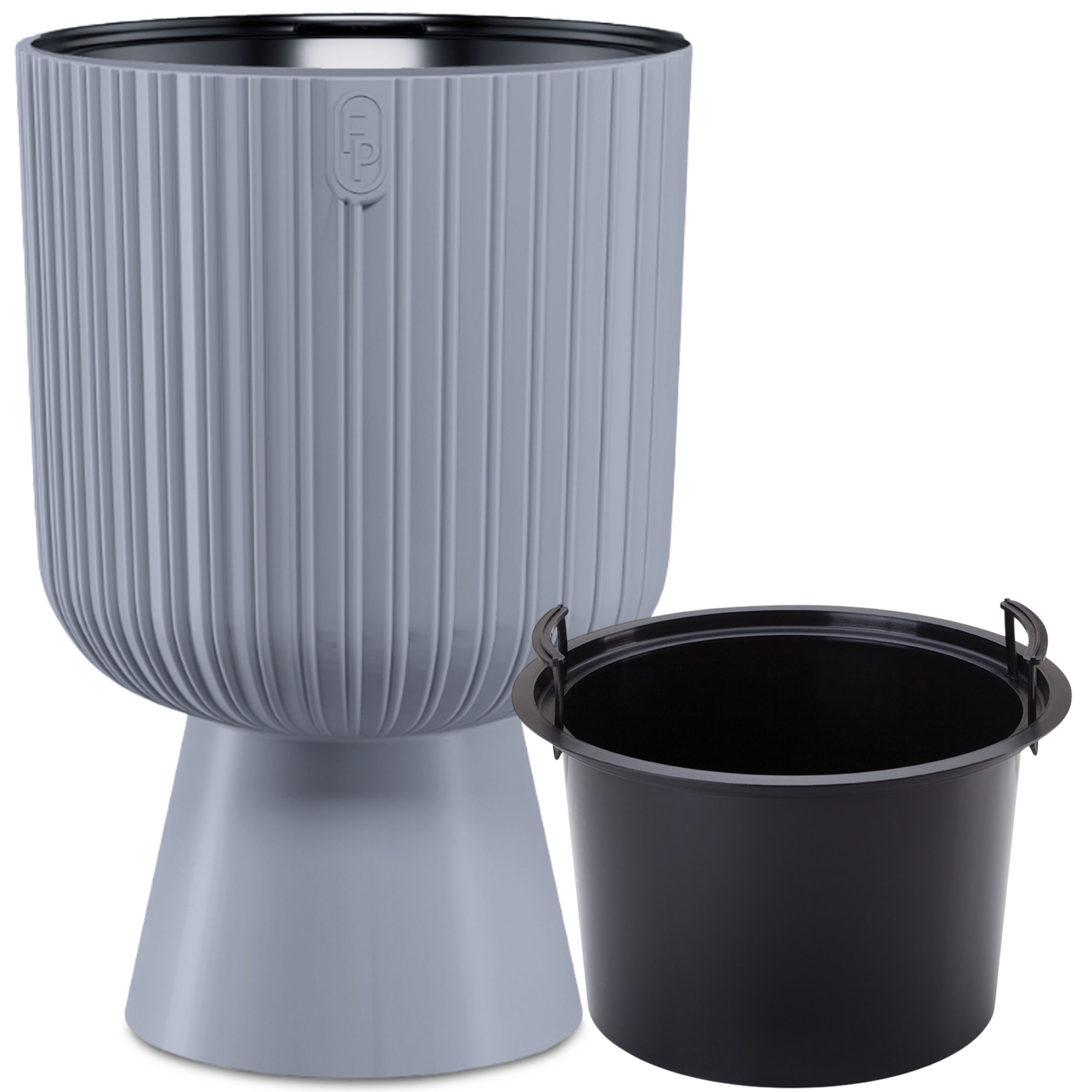 Doniczka okrągła Keli Mika 40, Platyna. Duża, okrągła doniczka o prążkowanej fakturze pionowych żłobień, z poszerzaną ku dołowi, gładką nóżką. Doniczka w kolorze platynowym z czarnym wkładem. Piękny, nowoczesny wzór nada wnętrzu elegancji i przyciągnie wzrok gości, szczególnie w połączeniu z rośliną zieloną o dużych liściach. Donica odporna na promieniowanie UV i niskie temperatury, mrozoodporna. Idealna na zewnątrz m.in. do ogrodu, na taras. Wspaniale współgra z nowoczesnymi, ozdobnymi trawami. Do 80% stworzona z recyklingu. Doniczka o pojemności wkładu 13,7 litra. Produkt sygnowany marką Fashion Pots. Nadaje się do recyklingu w 100%.
