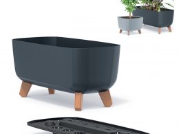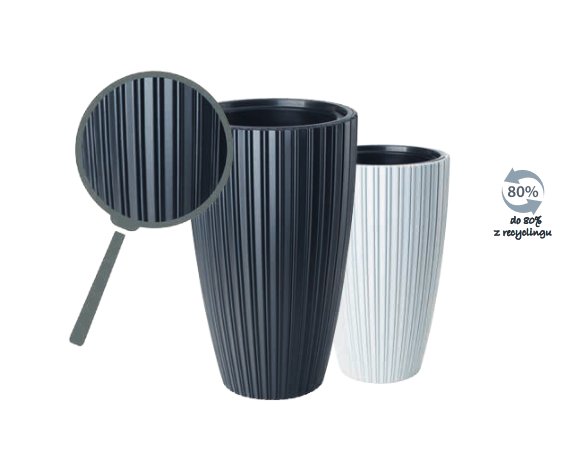 Doniczka okrągła Mika 40 cm. z wkładem, Antracyt. Doniczka duża, niska, okrągła Mika, w kolorze antracytowym, z dołączonym wkładem, o prążkowanej fakturze pionowych żłobień. Doniczka lekko zwężana ku dołowi. Piękny, nowoczesny wzór nada wnętrzu elegancji i przyciągnie wzrok gości, szczególnie w połączeniu z rośliną zieloną. Doniczka Mika jest wytrzymała na uszkodzenia. Donica odporna na działanie warunków atmosferycznych: promieniowanie UV, niskie temperatury, mróz. Dzięki swojej wytrzymałości idealnie nada się na zewnątrz m.in. do ogrodu, na taras. Wspaniale współgra z nowoczesnymi, ozdobnymi trawami. Do 80% stworzona z recyklingu. Produkt marki Fashion Pots, o pojemności wkładu 13,7 l. Nadaje się do recyklingu w 100%. Dane techniczne: Wysokość: 42 cm. Średnica: 38,5 cm. Pojemność: 36 l. Producent: Form-Plastic.