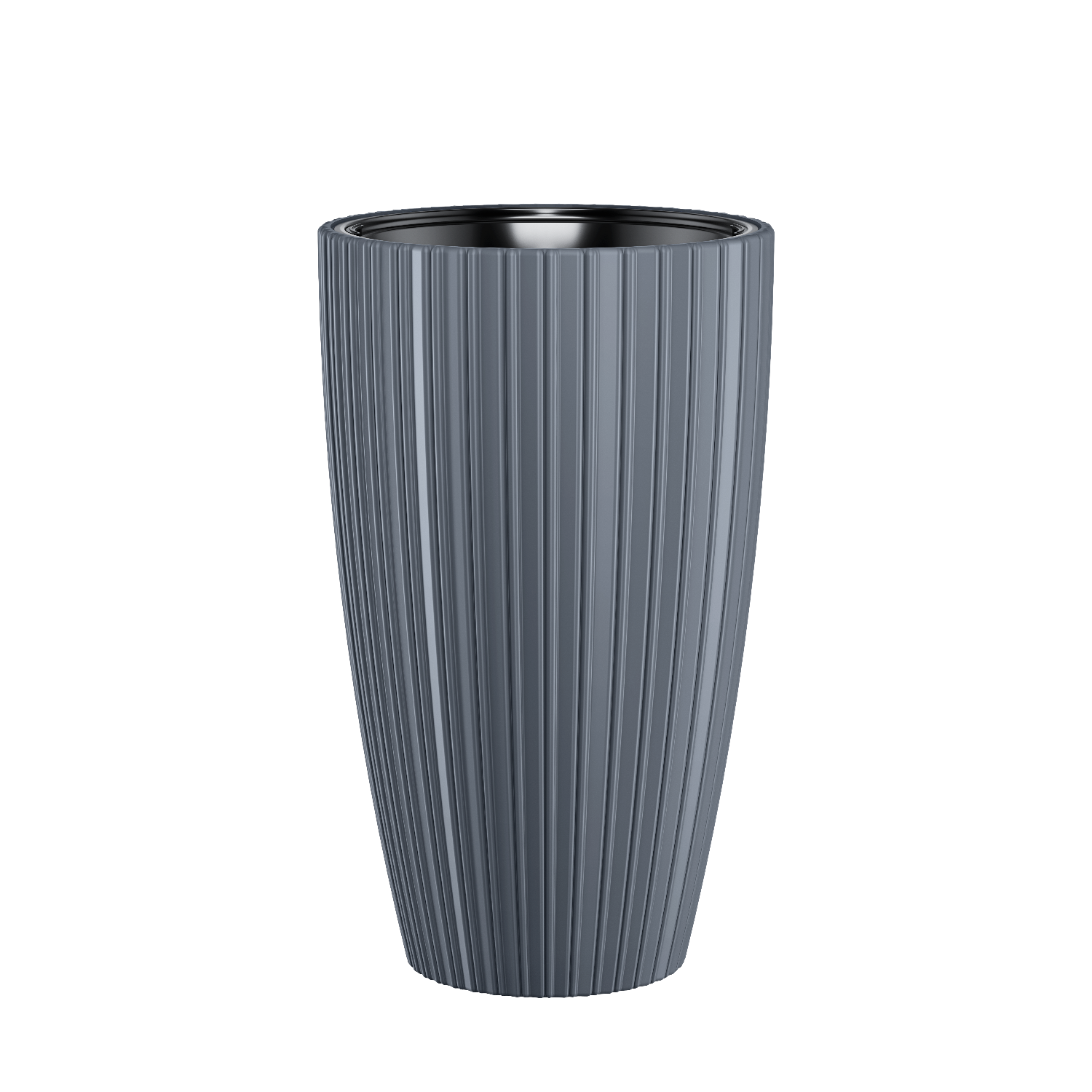 Doniczka okrągła Mika Slim 40 z wkładem, Antracyt. Wysoka, smukła, okrągła doniczka Mika z dołączonym wkładem, o prążkowanej fakturze pionowych żłobień. Doniczka w kolorze antracytowym. Lekko zwężana ku dołowi. Piękny, nowoczesny wzór nada wnętrzu elegancji i przyciągnie wzrok gości, szczególnie w połączeniu z rośliną zieloną. Doniczka Mika jest wytrzymała na uszkodzenia. Donica odporna na działanie warunków atmosferycznych: promieniowanie UV, niskie temperatury, mróz. Dzięki swojej wytrzymałości idealnie nada się na zewnątrz m.in. do ogrodu, na taras. Wspaniale współgra z nowoczesnymi, ozdobnymi trawami. Do 80% stworzona z recyklingu. Produkt marki Fashion Pots, o pojemności wkładu 13,7 l. Nadaje się do recyklingu w 100%. Dane techniczne: Wysokość: 58 cm. Średnica: 38,5 cm. Pojemność: 51 l. Producent: Form-Plastic.