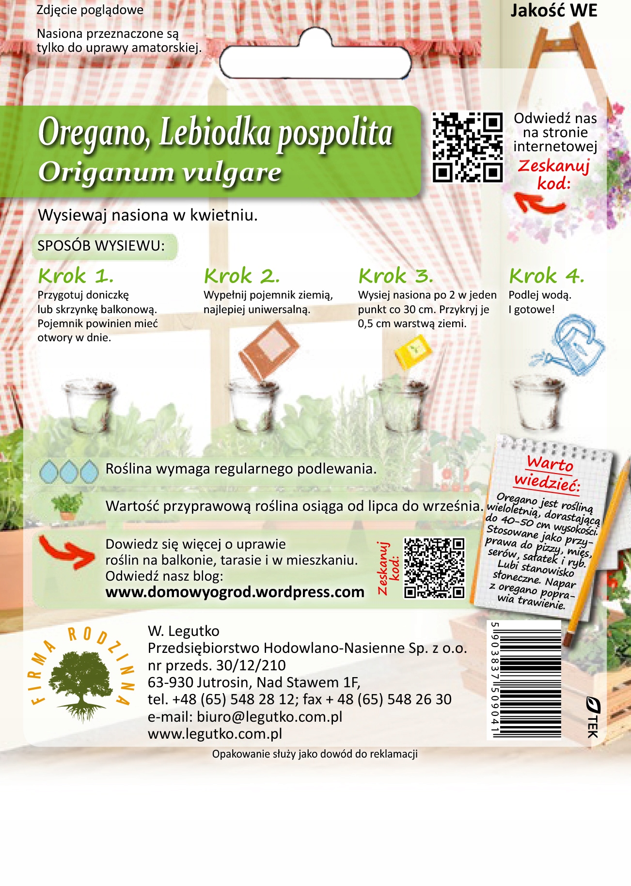 Seria nasion ” Domowy Ogród” umożliwia stworzenie własnego ogródka w doniczce, pojemniku lub skrzyce. Postępując zgodnie z instrukcja znajduącą się na opakowniu przekonasz się jak w łatwy sposób moża uprawiać rośliny w mieszkaniu na balkonie czy tarasie. Bez potrzeby posiadania ogródka będziesz miał dostęp do własnych warzyw i ziół. Oregano jest rośliną wieloletnią, osiągające wysokość 40- 50 cm. Stosowane jako przyprawa do pizzy, mięs, serów, sałatek i ryb. Lubi stanowisko słoneczne. Napar z oregano poprawia trawienie.