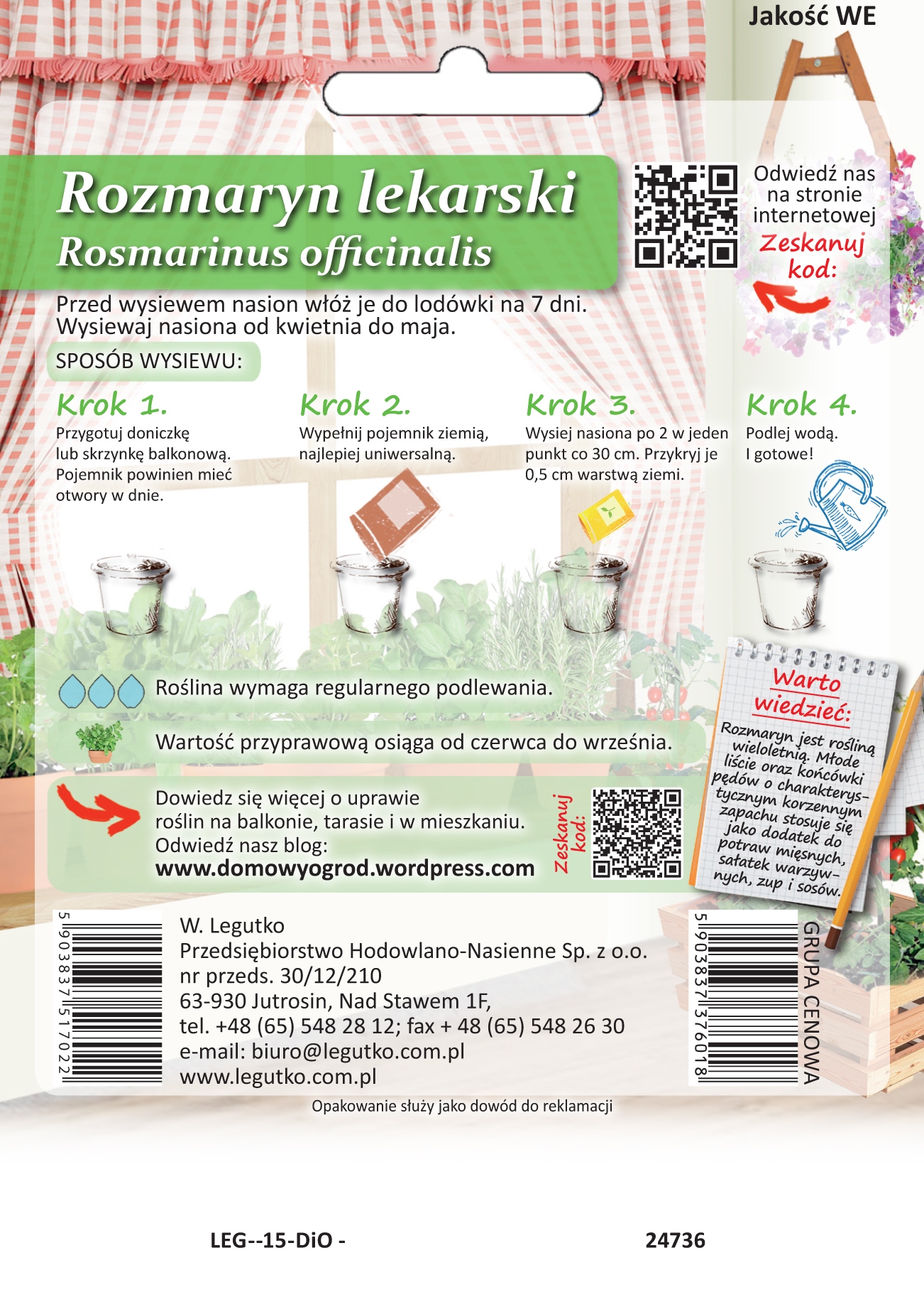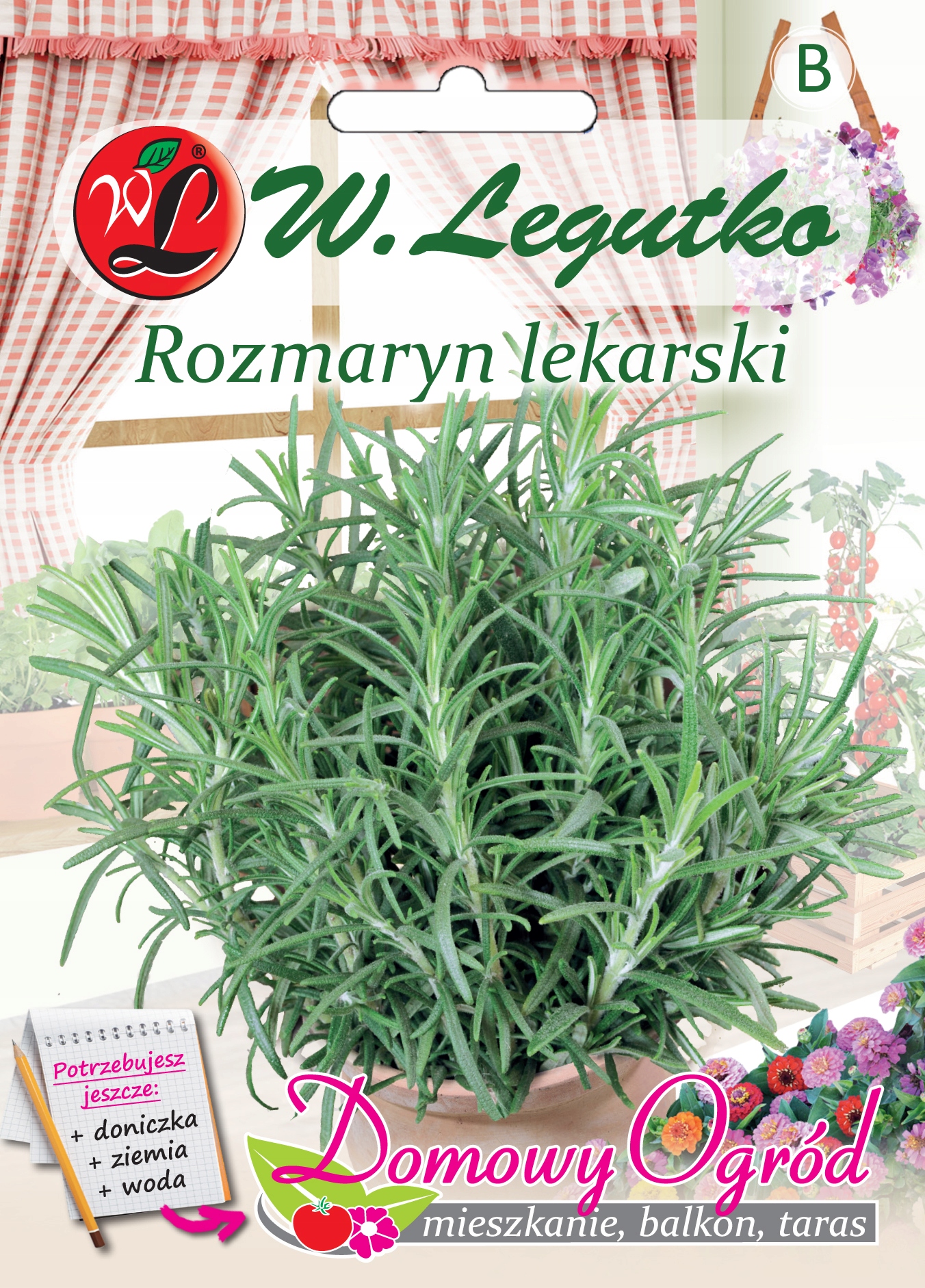 Seria nasion ” Domowy Ogród” umożliwia stworzenie własnego ogródka w doniczce, pojemniku lub skrzyce. Postępując zgodnie z instrukcja znajduącą się na opakowniu przekonasz się jak w łatwy sposób moża uprawiać rośliny w mieszkaniu na balkonie czy tarasie. Bez potrzeby posiadania ogródka będziesz miał dostęp do własnych warzyw i ziół. Rozmaryn jest rośliną wieloletnią. Młode liście oraz końcówki pędów o charakterystycznym korzennym zapachu stosuje się jako dodatek do potraw mięsnych, sałatek warzywnych, zup i sosów.