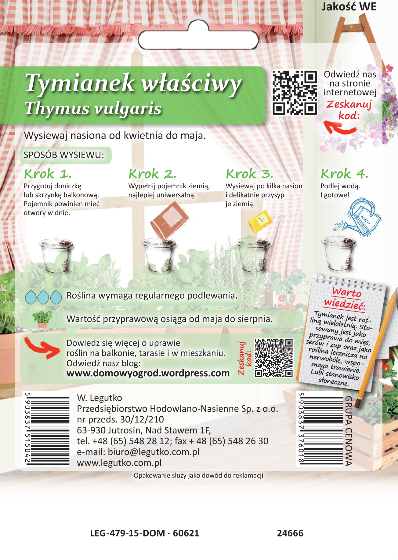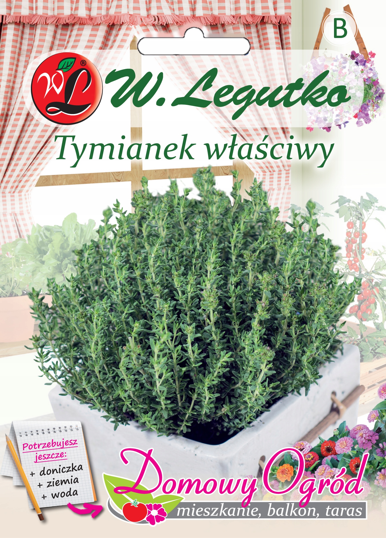 Seria nasion ” Domowy Ogród” umożliwia stworzenie własnego ogródka w doniczce, pojemniku lub skrzyce. Postępując zgodnie z instrukcja znajduącą się na opakowniu przekonasz się jak w łatwy sposób moża uprawiać rośliny w mieszkaniu na balkonie czy tarasie. Bez potrzeby posiadania ogródka będziesz miał dostęp do własnych warzyw i ziół. Tymianek jest rośliną wieloletnią. Stosowany jest jako roślina przyprawowa do mięs, serów i zup oraz jako roślina lecznicza ma nerwobóle, wspomaga trawienie. Lubi stanowisko słoneczne.