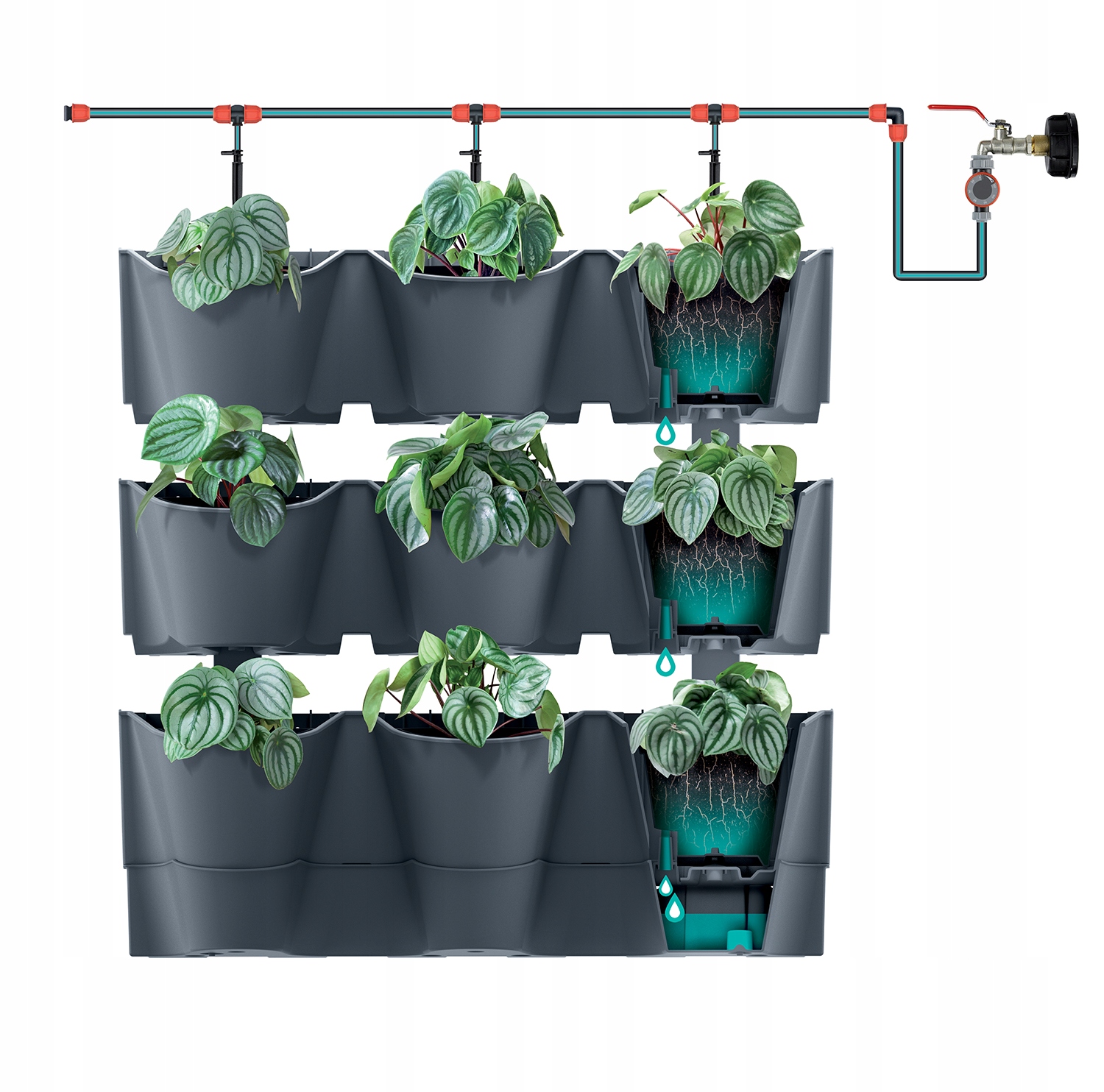 Dzięki przepływowemu systemowi nawadniania rośliny są równomiernie zaopatrzone w wodę.