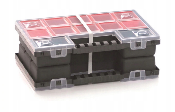 To wygodne i użyteczne pojemniki, które można praktycznie zastosować do wszystkiego. Dobre na drobiazgi, jak i na większe elementy. Technologia zamknięcia sprawia, że włożony asortyment do wewnątrz, nawet w przypadku ułożenia organizera spodem do góry nie miesza się. Organizer wykonany z wytrzymałego polipropylenu.